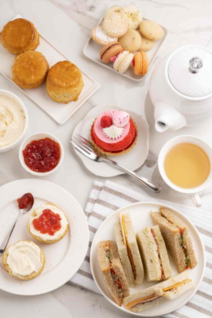 Includes 1 Scone, 1 Macaron, 1 Cake Slice, 2 Cookies, 2 Finger Sandwiches and Choice of Beverage.