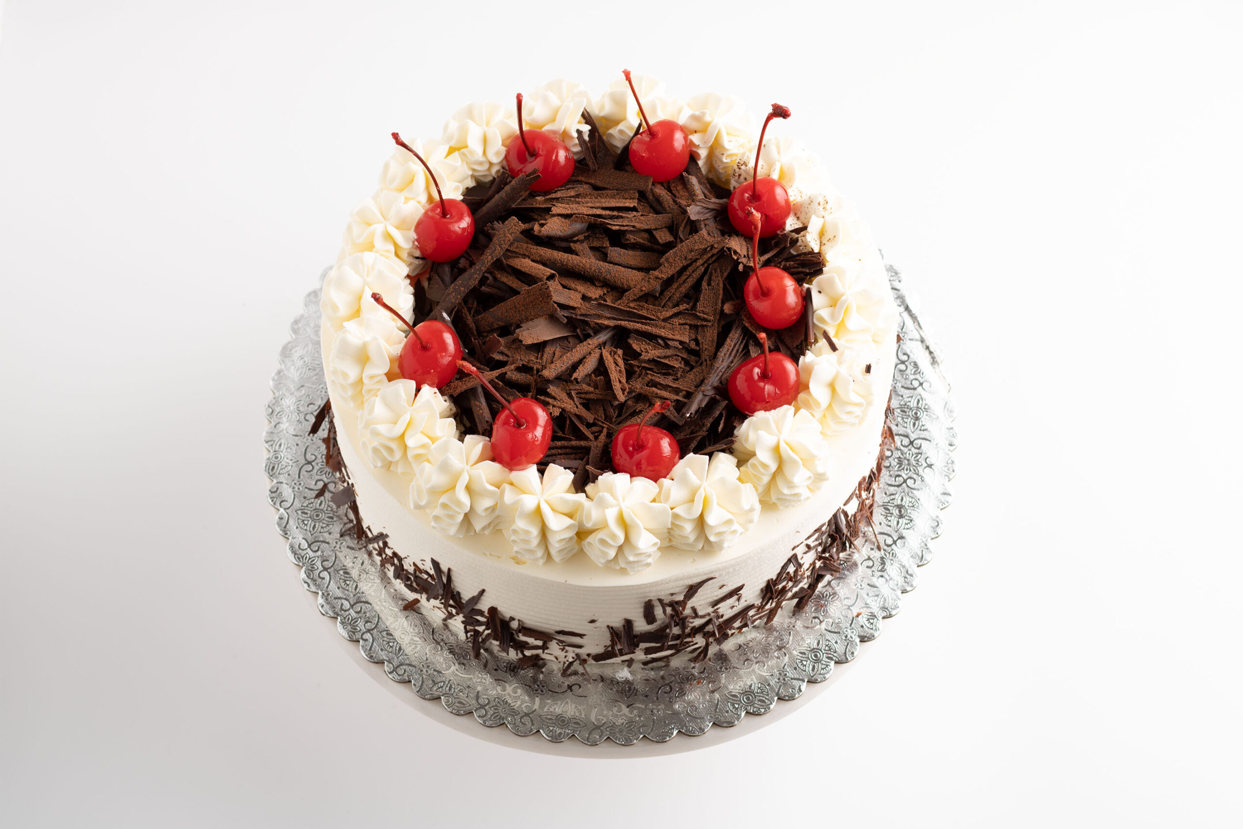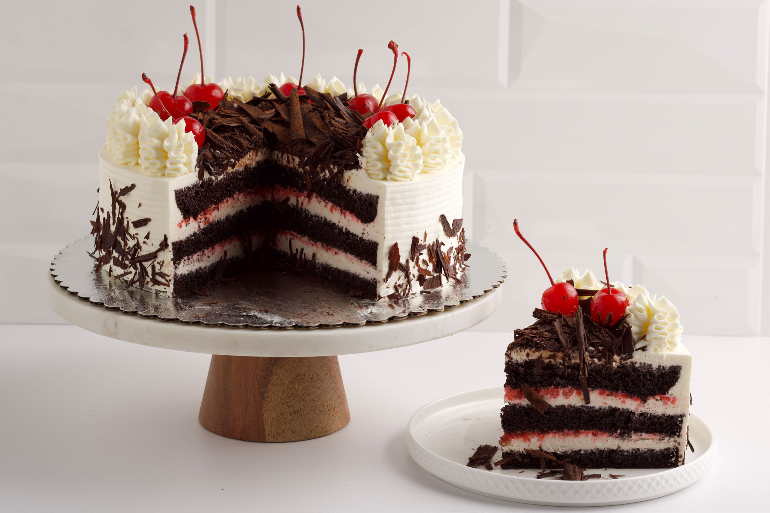 We’ve captured all the rich fruitiness of a Black Forest gateau in this classic cake. Fresh vanilla cream and a deliciously dark cherry filling made with 70% fruit are sandwiched between three layers of light Belgian chocolate sponge. The cake is elegantly finished with vanilla cream and topped with chocolate pieces and glazed cherries.