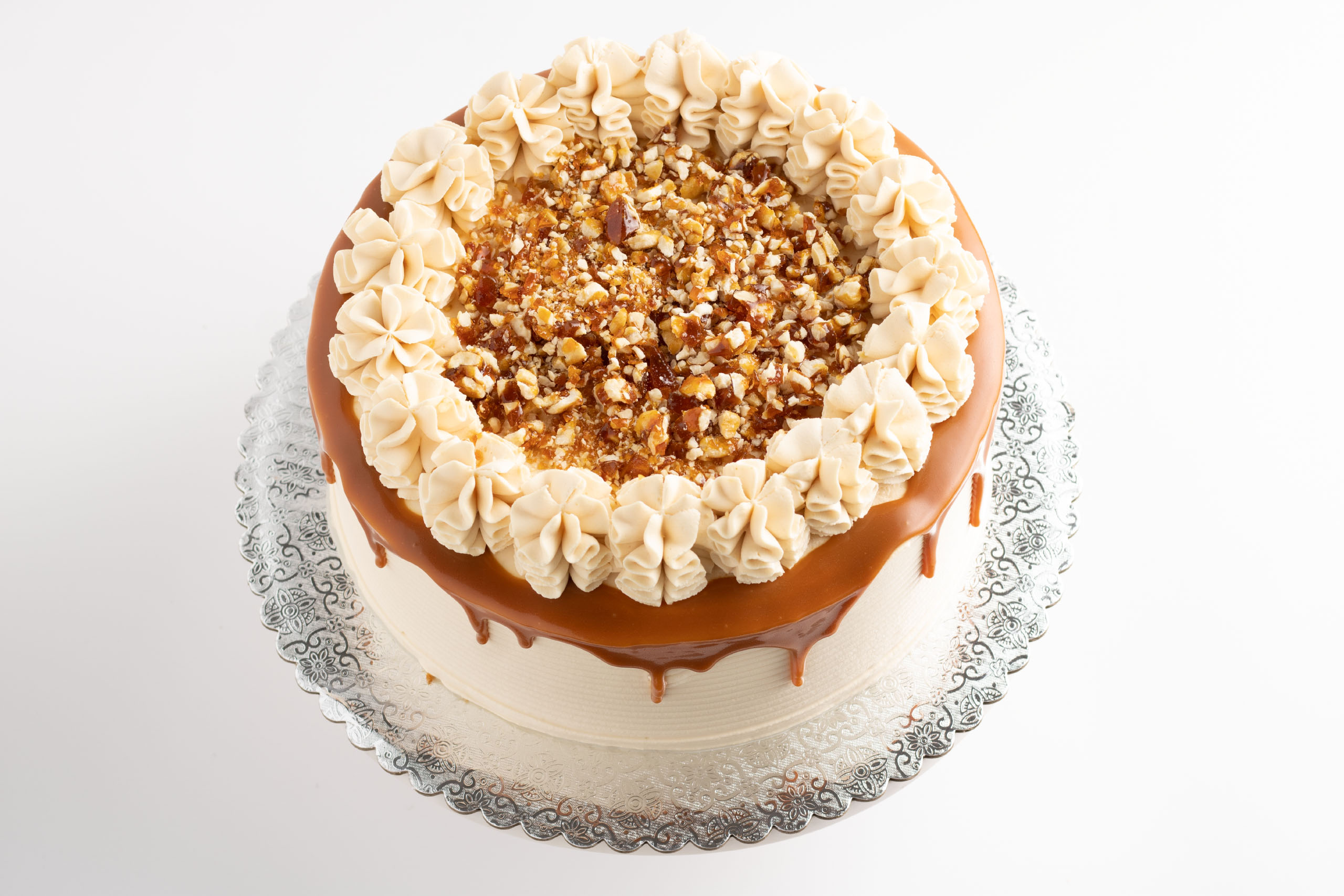 Our Butterscotch cake is a best seller. It features three layers of light vanilla sponge sandwiched with sweet, nutty nougat, crunch butterscotch and sweet butter cream. It’s finished with a fresh vanilla whipped cream, delicately decorated with crumbled nougat pieces and hand-made, nut brittle.