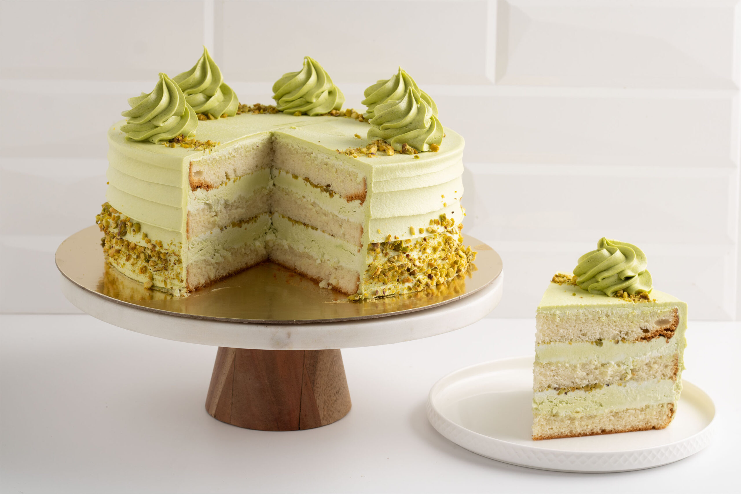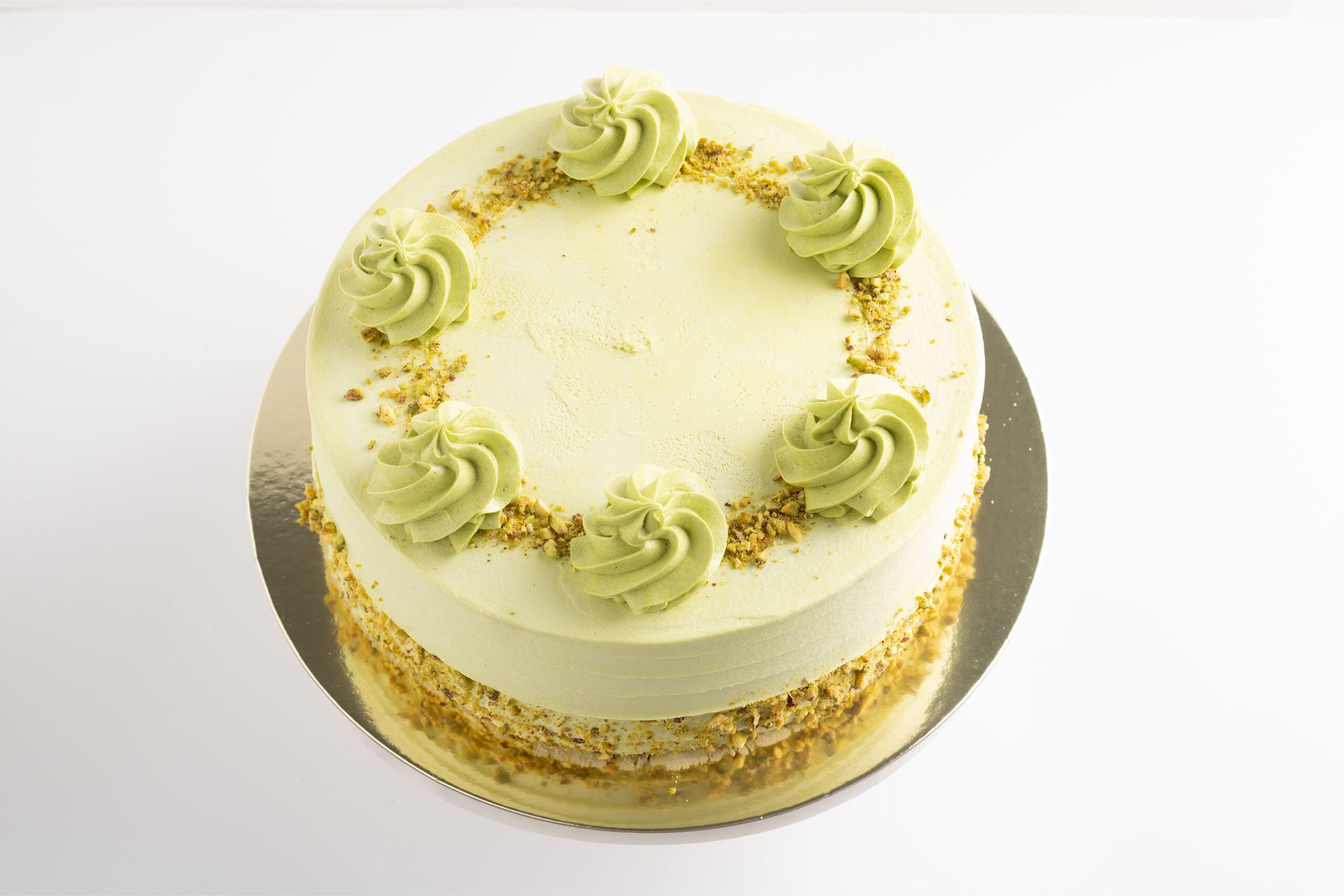 This striking cake is all about pistachio. Three layers of vanilla sponge are layered with pistachio fresh cream, which is created from naturally flavored vanilla cream and ground pistachio nuts. We use this deliciously nutty cream to elegantly cover the cake and complete the design with crushed pistachio.