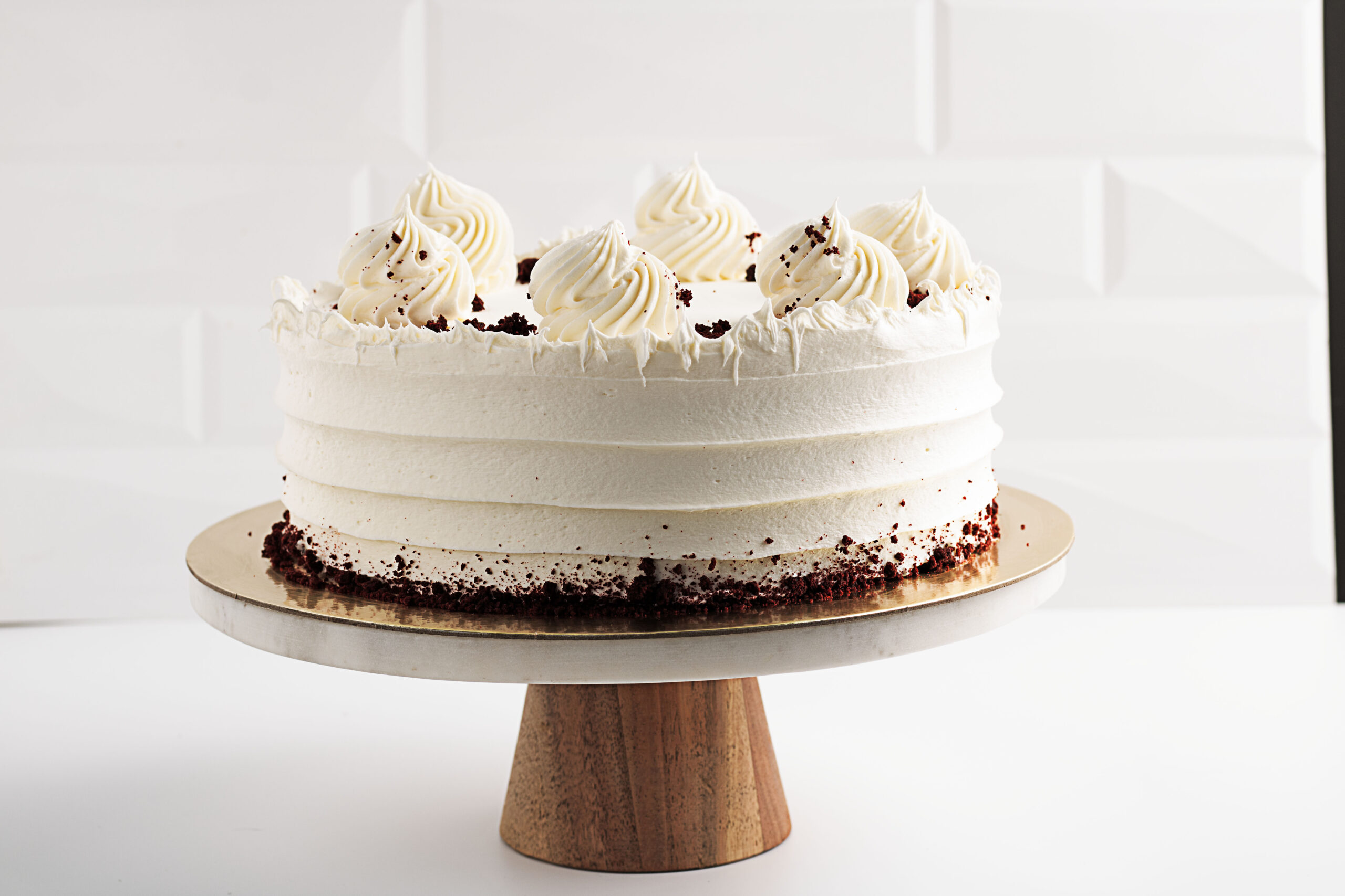 Beautiful in its simplicity, this luxurious red velvet sponge is made with buttermilk and adorned with three layers of fresh vanilla cream. We delicately cover the outside of the cake in a fresh cream layer and finish the design with red velvet crumbs and cream swirls.